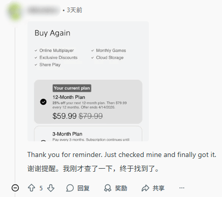 除了25%的常规折扣,也有部分玩家表示自己收到了力度更高的优惠,比如在会员订阅过期数月后,成功申领到35%的折扣。值得注意的是,这类折扣的触发还与购买渠道相关,例如通过手机应用办理续费,相比在主机商店直接续费,更有可能触发相应优惠。