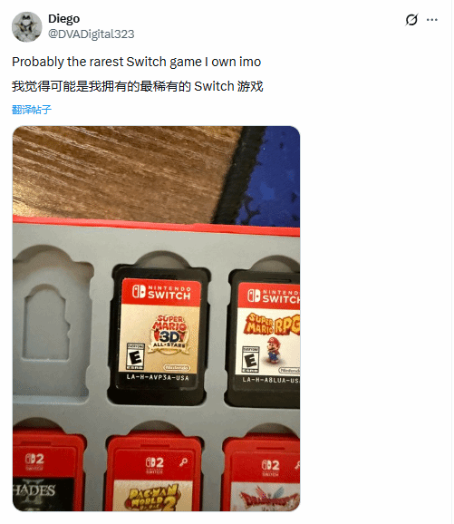 不久前,一位长期关注任天堂的玩家在社交平台晒出了自己的Switch游戏藏品,还配文说道:“这应该是我手里最难得的Switch游戏了。”从他分享的照片能看到,这款游戏卡带正是2020年曾被玩家疯抢的《超级马力欧3D合集》(Super Mario 3D All-Stars)。