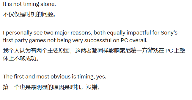 @kabrutusdeid在解读的最后给出了自己的观点,他认为索尼如果想改善PC端的销售情况,有两条可行的路可选:一是让PC版本和主机版本同步首发,并且专门针对Steam平台制定推广方案;二是如果PC版本延迟上线,就大幅降低定价。从索尼目前的运营思路来看,想要改变销量低迷的现状,难度不小。