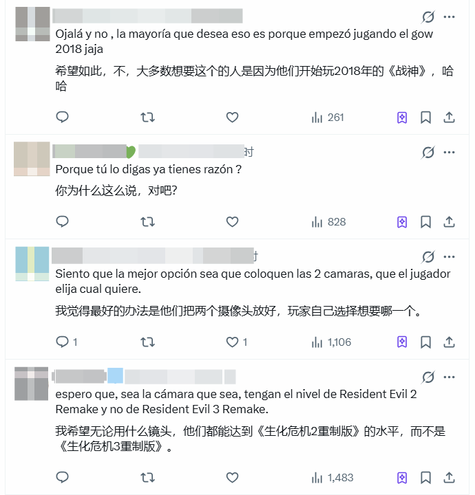 质量焦虑也成为讨论的重点之一:“我希望无论最后用哪种视角,都要达到《生化危机2:重制版》的水平,千万别做成《生化危机3:重制版》那样。”另有玩家补充道:“我觉得智能相机最好,不是100%固定,但肯定也不是越肩。有时候固定视角确实会存在死角问题。”