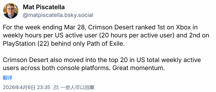 除了超高的游玩时长,《红色沙漠》在用户活跃度上也表现亮眼,目前已稳定跻身美国主机平台周活跃用户前20名,其中PS端排名第14位,Xbox端排名第18位。值得关注的是,排在它身前的大多是常年占据榜单前列的长线服务型游戏,而作为一款新近发售的单机作品,能取得这样的成绩,足以证明其强劲的市场竞争力和玩家认可度。