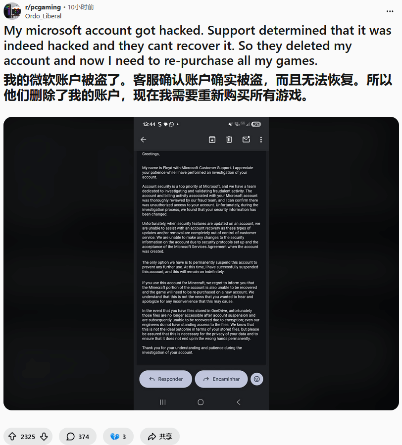 近日,玩家Ordo_Liberal在Reddit论坛分享了自己的糟心经历:他的微软(Microsoft)账号不幸被盗,本想通过客服找回,却得到了一个令人无法接受的答复——账号无法恢复,还将被永久封停,账号内所有数字资产也随之无法找回,相当于此前购买的游戏都要重新购买。