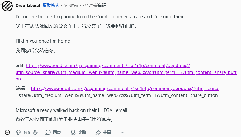 此外,他还透露,律师已为其提供了两种解决方案:相对简便的一种是通过威胁采取法律行动,迫使微软协助找回账号,这也是他计划优先尝试的方式;另一种则是直接起诉微软,索要精神损失费,最高可获得约2000美元的赔偿。不过Ordo_Liberal表示,他的核心诉求只是拿回自己的微软账号,并不想过多纠缠。