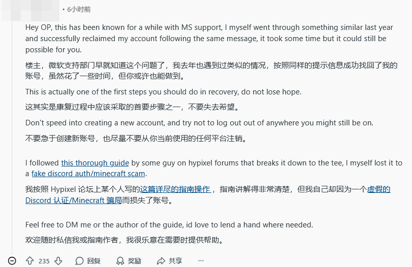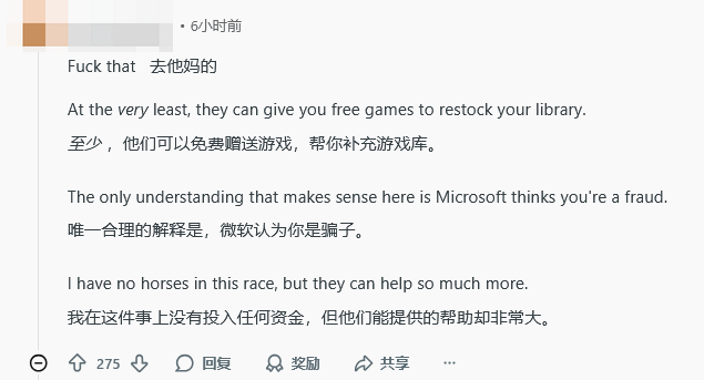 事件曝光后,迅速在玩家社区引发广泛关注。多数网友对Ordo_Liberal的遭遇表示同情,同时纷纷批评微软的处理政策缺乏人性化,未能充分考虑玩家的合法权益。还有不少玩家分享了自己类似的被盗经历,试图为他提供找回账号的思路和帮助。
