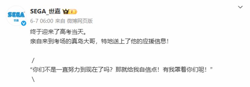 事实上,在高考首日即 6 月 7 日,世嘉便已通过真岛吾朗这一角色向考生们发布应援内容。这两次以游戏角色为载体的应援行为,在玩家群体中引发诸多讨论。