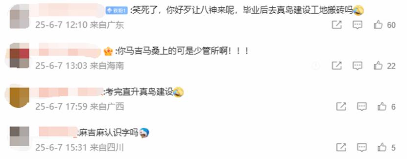 部分玩家以幽默调侃的方式回应,提及真岛吾朗在游戏中的背景设定,留下诸如 “真岛识字吗?”“真岛上的可是少管所”“毕业后去真岛建设工地搬砖吗” 等趣味评论 ;也有玩家从角色适配角度出发,认为《审判之眼 / 逝》中的八神隆之或许更适合作为向考生应援的角色人选。