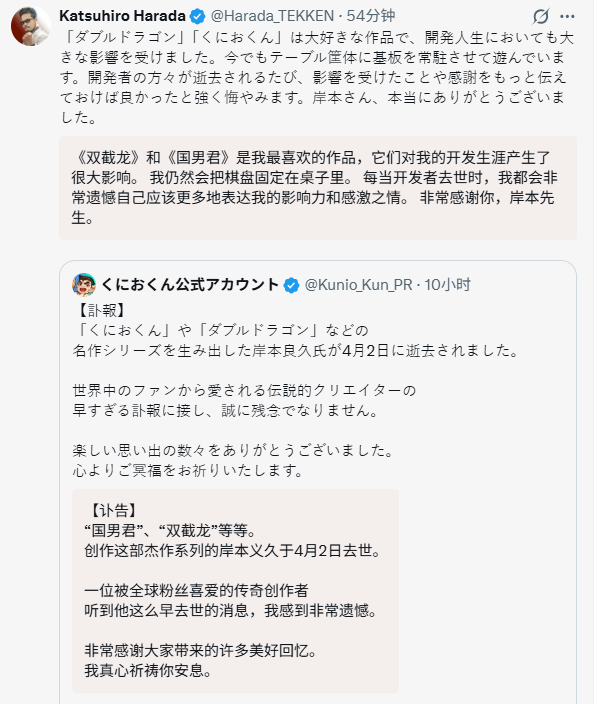 《双截龙》《热血》系列的创作者岸本良久不幸离世,享年64岁。消息传出后,游戏行业内众多人士纷纷表达缅怀之情,其中前《铁拳》系列制作人原田胜弘也特意发文,对这位前辈进行吊唁。