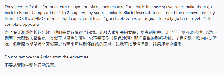针对这个问题,这位玩家也给出了自己的建议:他觉得官方可以添加一些地图事件或者限时活动,让敌人有机会重新夺回被玩家占领的据点,同时提高敌人的刷新频率。不然的话,就算游戏里的怪物再多、地图再大,迟早也会被玩家彻底清空,后期玩起来会格外枯燥。