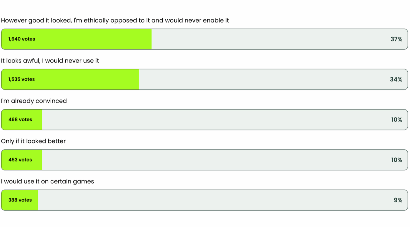 调查数据清晰呈现了玩家的分化态度,其中最引人关注的是,高达71%的受访者明确表示,无论如何都不会被说服开启DLSS 5功能,这份拒绝态度十分坚决。而在这部分拒绝者中,又分为两种不同的立场:37%的受访者表示,即便DLSS 5最终呈现的效果足够出色,他们也会因为“道德层面”的考量,始终不启用这一功能;另外34%则是单纯认为DLSS 5的画面效果不佳,因此坚决拒绝使用。