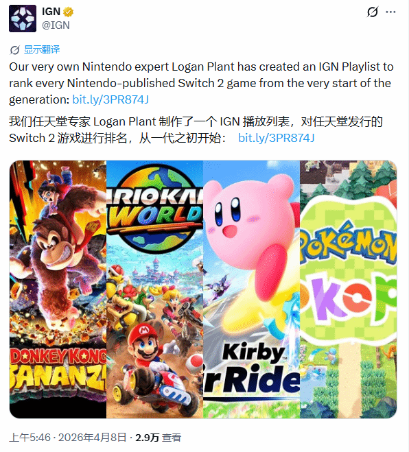 IGN任天堂领域专家Logan Plant发布了一份Switch 2第一方游戏排名榜单,对任天堂发行的14款Switch 2第一方独占游戏进行了全面梳理与排序,其中《咚奇刚:蕉力全开》成功登顶榜首,引发玩家广泛讨论。