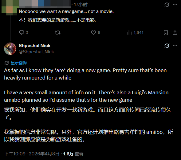 这则电影企划的爆料一出,就有玩家在评论中留言表示,相比于《路易吉鬼屋》电影,他们更期待一款全新的系列游戏。没想到Shpeshal Nick很快就回复了这条留言,顺势透露了任天堂正在开发《路易吉鬼屋》新作的消息,也算圆了不少玩家的心愿。