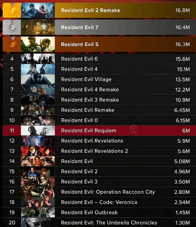 外网用户Heάяτ٭近日公开了一份《生化危机》全系列作品销量排名,这份榜单一经曝光,便引发了不少玩家的关注与讨论,尤其是关于系列最新作的排名,更是成为了焦点。