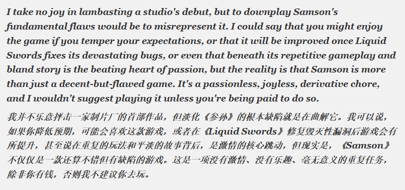 作为Liquid Swords工作室的处女作,《Samson》此前曾被玩家寄予厚望,可正式发售之后,其表现却差强人意,甚至可以用糟糕来形容。该作在Steam平台的好评率仅为51%,外媒GameRant更是在评测中毫不留情地批评道:“这绝非一款虽有瑕疵但尚可一玩的作品,它毫无激情、毫无乐趣,也毫无创新可言,玩起来更像是一份枯燥的苦差事。除非有人付费请你体验,否则我绝不建议你尝试。”