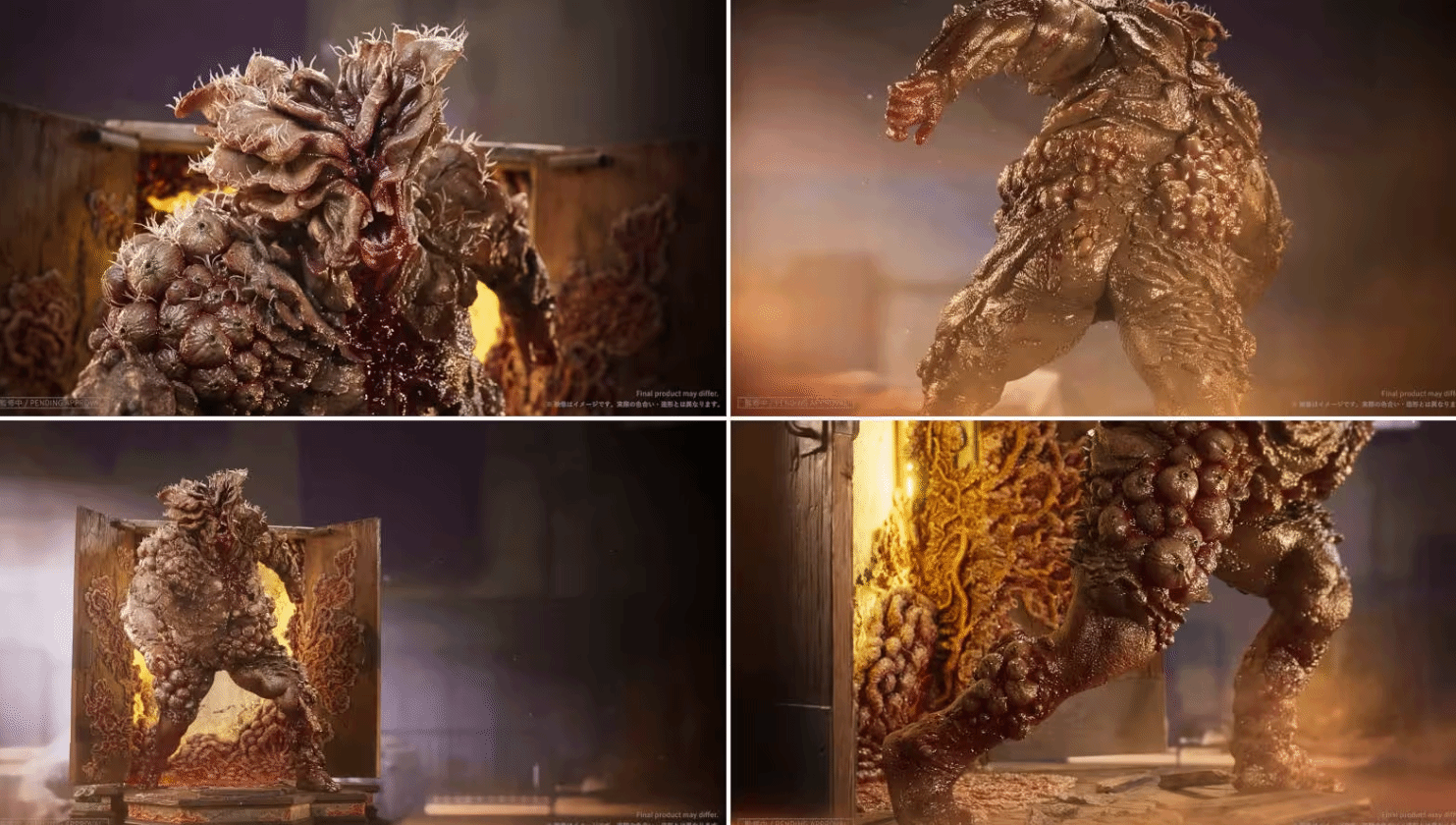 三款雕像中,最令人印象深刻的当属“巨无霸”雕像。作为感染者的最终形态,它的全身覆盖着厚实的真菌铠甲,看上去就像一座难以撼动的移动堡垒。雕像的底座设计成一扇破旧斑驳的铁门,搭配“巨无霸”本身庞大的体型,营造出极强的压迫感,视觉冲击力拉满。