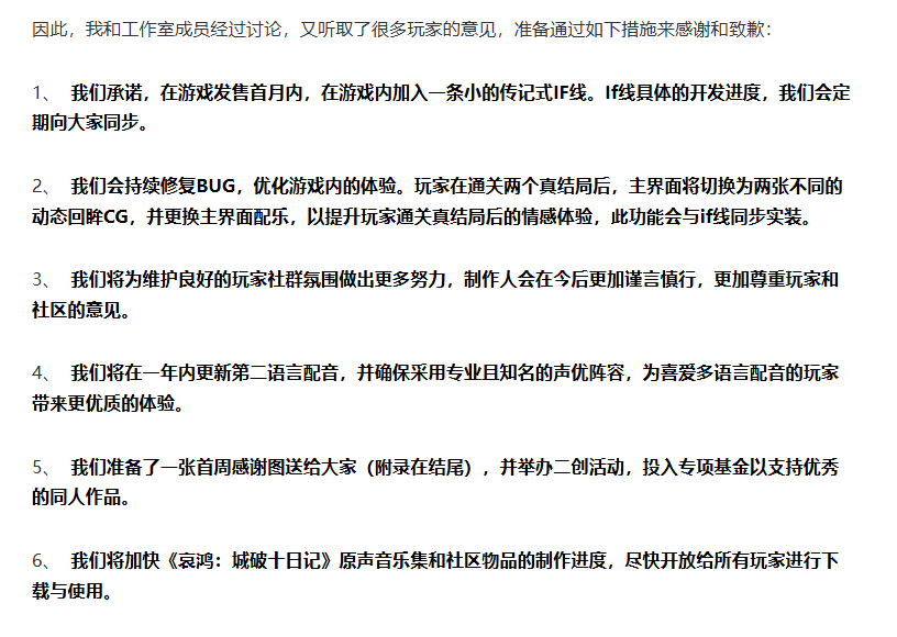 为尽可能弥补玩家的遗憾,嵇零代表团队公布了六项具体的整改措施:其一,在游戏上线首月内,新增一条传记式IF剧情线,同时推进相关开发进度;其二,修复游戏内存在的各类BUG,且在玩家通关双真结局后,对主界面的CG画面与配乐进行同步更换;其三,强化社群管理力度,自身也会谨言慎行,避免再引发不必要的争议;其四,在一年内完成专业知名声优阵容的第二语言配音制作并上线;其五,发布官方感谢图,同时举办二创相关活动,并投入专项基金支持玩家创作;其六,加速原声音乐集与社区相关物品的制作,完成后将开放免费下载。
