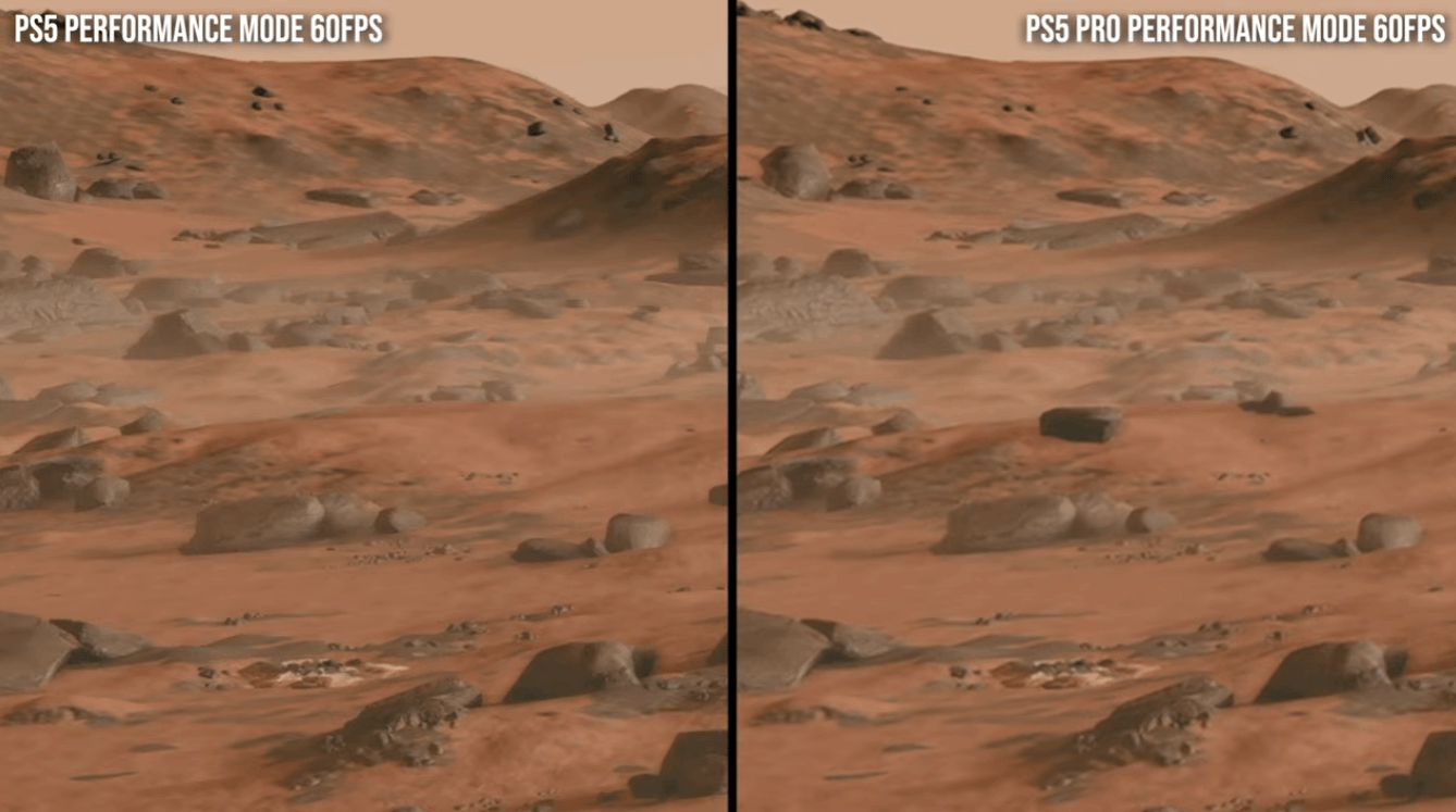 PS5 Pro版本的表现则更为复杂,主机内置7种预设模式及自定义选项,可组合出多达24种不同的游戏配置。其性能模式以60帧为目标,为此将分辨率降至原生900p,流畅度有所提升,部分场景帧率甚至比Xbox Series X领先近10帧,但初代PSSR缩放技术会带来明显的画面闪烁、动态噪点等问题;开启系统级PSSR 2后,画面清晰度和稳定性会有所改善,但在植被与环境阴影区域,仍存在明显瑕疵。