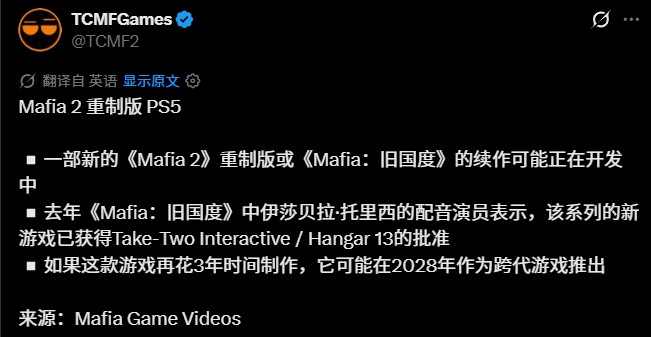 对于这款新项目的具体方向,目前流传的消息给出了两种可能性:要么是对《四海兄弟2》进行完整重制,要么是推出《四海兄弟 故乡》的正统续作。值得一提的是,这一爆料并非空穴来风,其消息来源是曾为游戏角色“伊莎贝拉·托里西”配音的演员,该演员早在2025年就曾透露,《四海兄弟》系列的新作已获得官方批准。