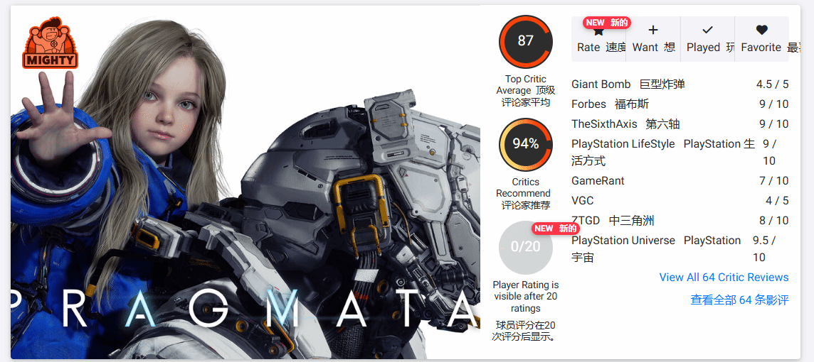 从目前公布的评分来看,本作口碑表现亮眼:opencritic站给出87分的综合评分,另有一家媒体为其打出8.6分的高分,除此之外,多家海外专业游戏媒体的评测也均以正面评价为主,聚焦游戏的创新玩法与剧情表现,给出了高度肯定。