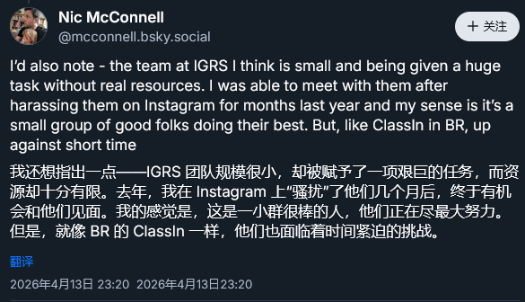最后,他为IGRS团队发声:“我还想说,IGRS团队规模确实很小,却要承担巨大的工作量。去年我花了几个月时间在Instagram上联系他们,后来有机会见面,能感受到他们是一群尽力做好工作的人。但和巴西的ClassInd一样,他们在时间和资源上都面临着很大压力。”