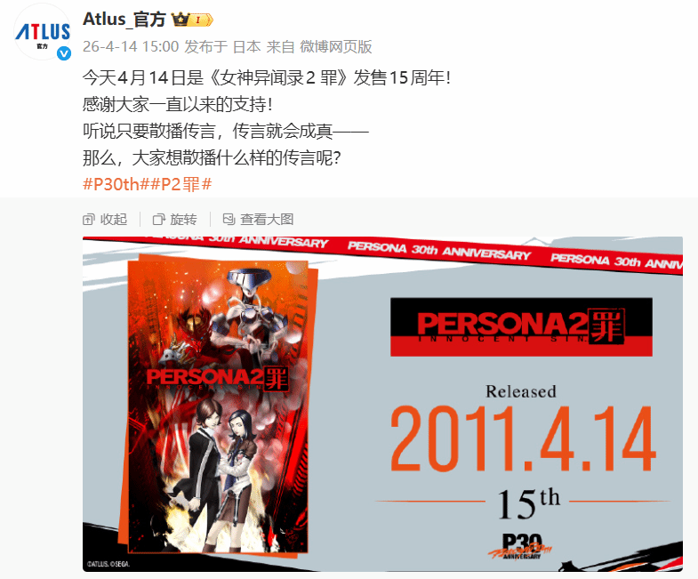 Atlus官方通过推文,为旗下经典角色扮演游戏《女神异闻录2 罪》(Persona 2: Innocent Sin)举办了发售15周年的庆祝活动。不同于常规的周年祝福,官方此次的发文暗藏玄机,迅速引发玩家群体的热烈讨论。