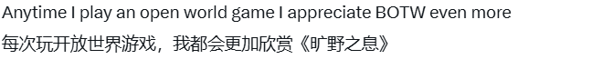 他的这番吐槽,很快得到了大批玩家的共鸣。不少玩家表示,和塞尔达系列相比,其他很多开放世界游戏都显得缺乏灵气、内容单薄,甚至有玩家坦言,即便重新游玩《塞尔达传说:风之杖》,也能感受到与前两款作品的差距,进而觉得其他游戏索然无味。