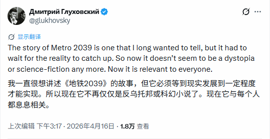作为《地铁2033》的核心编剧,德米特里·格鲁霍夫斯基此次继续执掌《地铁2039》的编剧工作,他在X平台发文表示:“我一直很想和你们讲《地铁2039》的故事,但现实目前还没发展到那一步(指游戏宣发节奏)。现在它不再仅仅是反乌托邦或科幻小说了。现在它与每个人都息息相关。”