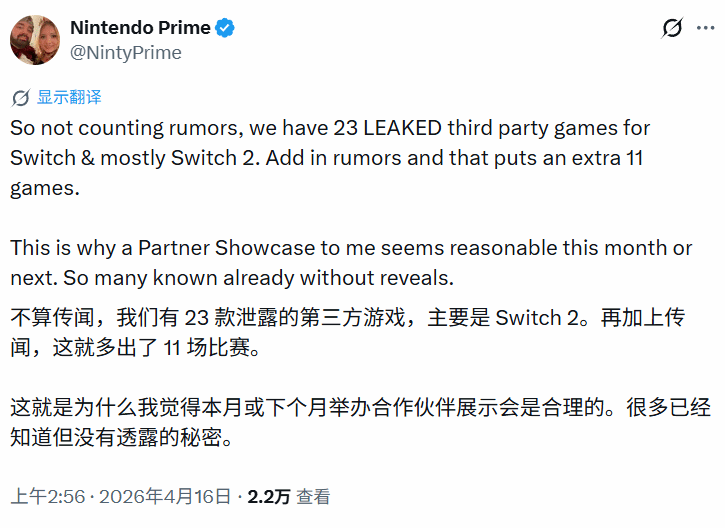 博主@NintyPrime 对此事发表了自己的看法,他表示,若剔除那些没有实锤的流言,目前已有23款第三方游戏通过各类渠道被泄露;倘若将流言包含在内,这一数字则会飙升至34款。如此庞大的未公开游戏信息,也让他认为,任天堂在近期举办一场“第三方合作伙伴发布会”,集中公布这些作品是十分合理的选择。