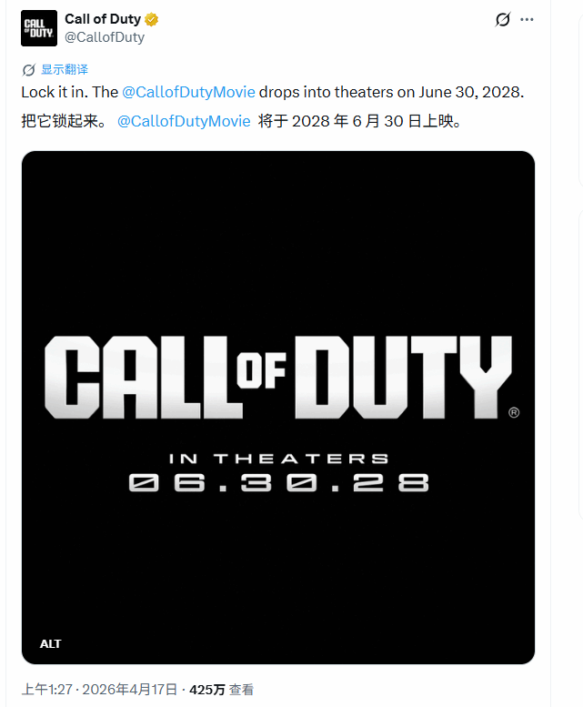 在正在举办的CinemaCon电影产业大会上,派拉蒙-天舞影业(Paramount-Skydance)正式官宣了热门射击游戏《使命召唤》真人电影的上映时间。这部改编自动视暴雪同名经典游戏的影片,确定将于2028年6月30日登陆北美各大影院。