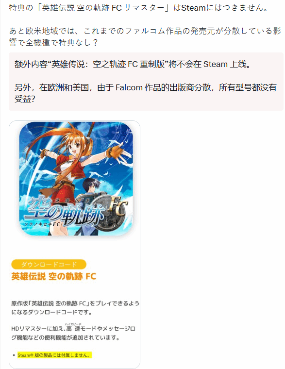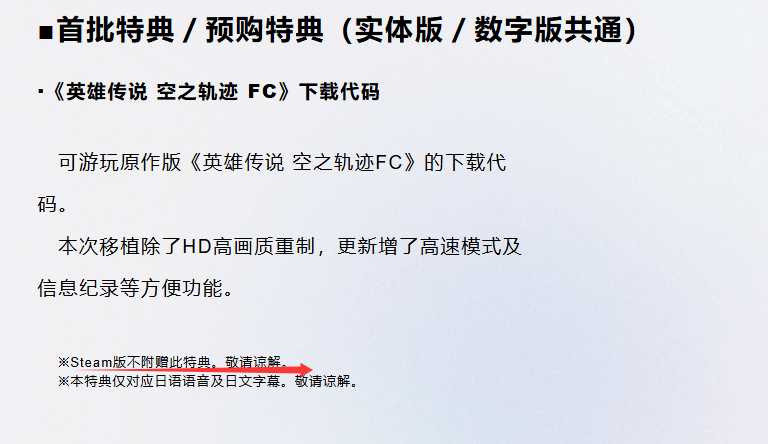 然而,这款游戏的预购附带福利却引发了玩家群体的广泛讨论。根据官方公布的信息,本次预购特典包含原版《空之轨迹 FC》的下载权限,但这一福利仅面向主机版本玩家,Steam平台的PC玩家无法获得该附赠内容。