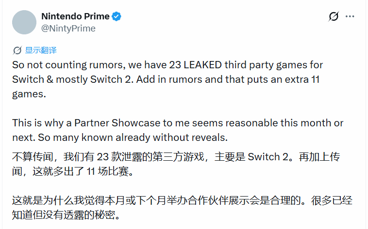 据Nintendo Prime统计,截至目前,已有23款NS2第三方游戏的评级信息被泄露,再加上那些尚未证实的传闻作品,相关游戏数量已经突破了30款。基于这一情况,他们做出推测,任天堂大概率会在近期举办合作伙伴直面会,将这些已泄露的游戏集中向公众公布。