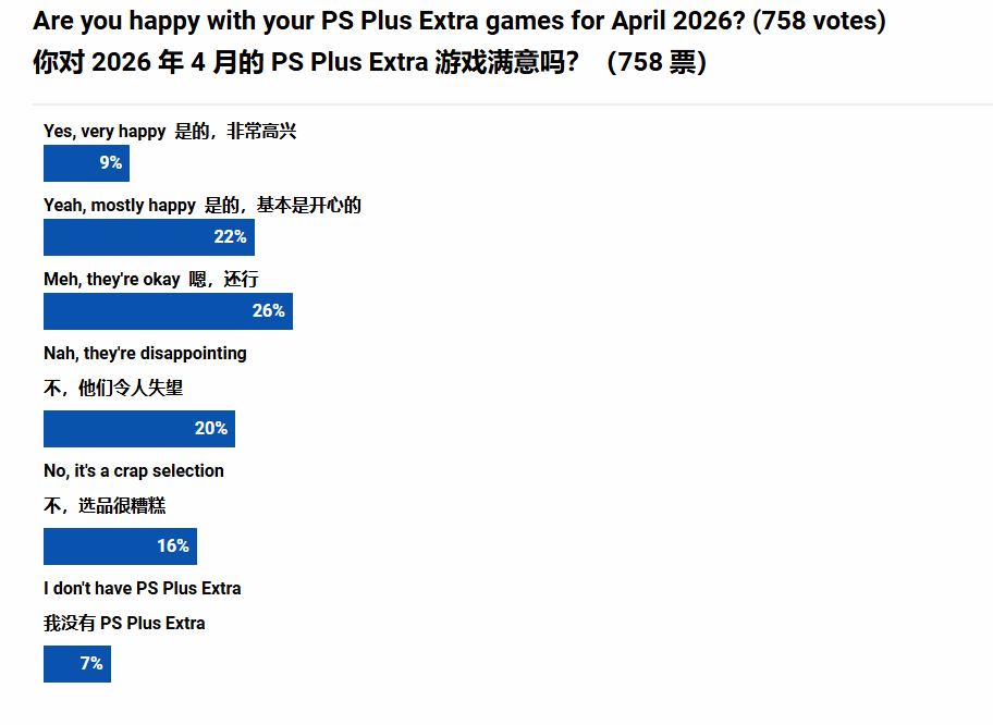 外媒pushsquare曾针对本次PS+二三档更新阵容,发起过一次玩家满意度调查,从统计结果来看,玩家的评价呈现明显的两极分化,且负面声音占比不低。参与调查的玩家中,仅有22%表示基本满意,9%给出非常满意的评价,26%的玩家表示认可;与之相对的是,20%的玩家感到失望,16%的玩家直接给出“非常垃圾”的负面评价,不满情绪尤为突出。