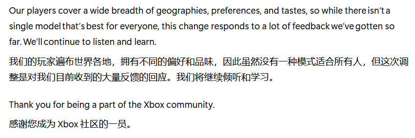 微软在公告中作出说明,称全球玩家分布在不同地区,有着不同的游戏偏好和需求,不存在能满足所有玩家的统一服务模式。此次调整是对近期收到的大量玩家反馈的回应,未来微软还会持续倾听玩家声音,不断优化服务,同时感谢所有Xbox社区成员的支持。