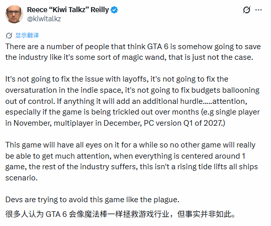 知名业内爆料人Kiwitalkz针对当下欧美游戏行业的困境,发表了一番犀利观点,直接否定了外界对《GTA6》的过高期待——很多人将这款重磅作品当作“行业救星”,但在他看来,这种期待终究只是泡影,《GTA6》根本无力解决行业深层的结构性症结。