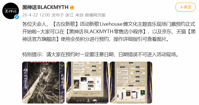 各位“天命人”,期待已久的夜场“入场凭证”终于开启预约!《黑神话》官方举办的「古仪新歌」面具艺术展,其夜场专属活动——“新歌Livehouse 面具主题音乐现场”,今日正式开放门票预约通道。