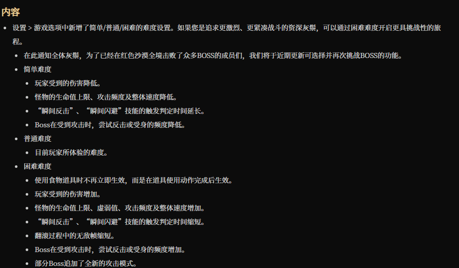 本次更新覆盖面极广,涵盖难度设置、家园、宠物、操作、战斗、画面等多个核心系统,每一项调整都精准贴合玩家需求,彻底解决了此前不少玩家反馈的痛点问题。其中,最受关注的莫过于新增的游戏难度调节功能,共分为简单、普通、困难三档,玩家可根据自身操作水平灵活选择。简单模式下,敌人强度会相应降低,弹反和闪避的判定时间也会延长,新手玩家能更轻松上手;困难模式则大幅提升敌人强度,缩短无敌帧时长,部分Boss还会解锁全新攻击模式,为硬核玩家带来更强挑战。官方同时透露,“Boss再挑战”功能也将在近期上线,满足玩家重温高难度战斗的需求。