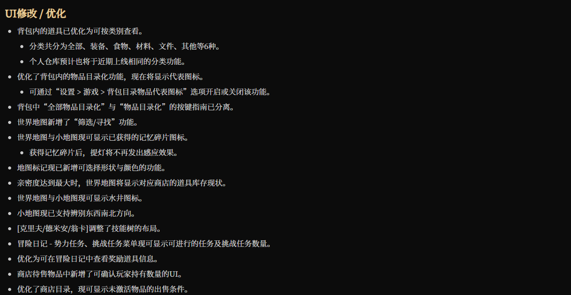 操作与UI优化同样贴心,大幅提升游戏手感。新增键盘/鼠标及控制器操作预设,玩家可根据自身习惯快速调整;闪避操作新增两种方式,连按两次或长按均可触发,适配不同操作偏好;道具锁定功能可有效防止误丢珍贵物品,背包新增分类查看功能,找物更高效;世界地图加入筛选、寻找功能,地图标记还能自定义形状和颜色,探索导航更便捷。