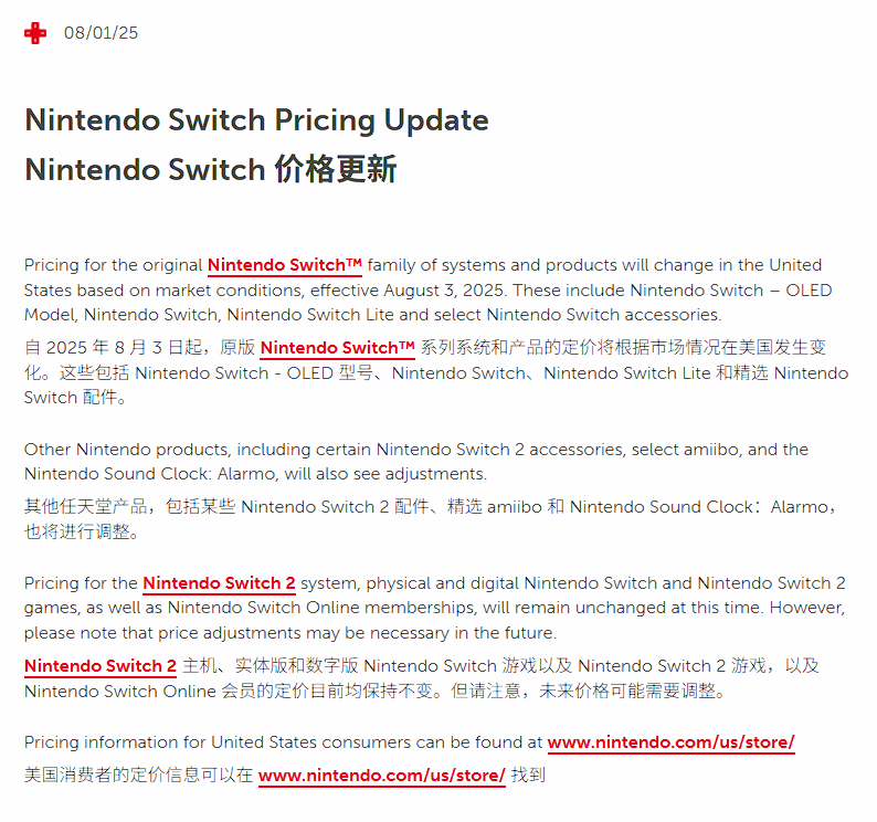事件的起因要追溯到2025年8月,当时任天堂宣布调整美国地区Switch主机及部分Switch、Switch 2配件的售价,对外仅模糊解释为“市场波动”,但明眼人都能看出,此次涨价实则是为应对当时的关税压力,将额外增加的成本转嫁给了消费者。