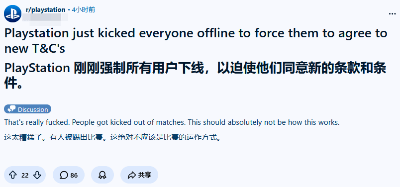 还有很多玩家表示,被突然踢下线的那一刻十分慌张,第一反应还以为自己的PSN账号被盗,直到看到强制阅读协议的提示,才明白是怎么回事。