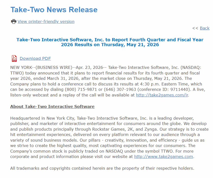根据官方发布的信息,Take-Two Interactive将在2026年5月21日(周四)股市收盘后,正式公布公司第四季度及2026财年的财务业绩,此次财报统计的数据截止到2026年3月31日。与此同时,惯例性的投资者电话会议也将在当天举行,公司CEO施特劳斯·泽尔尼克将在会议中分享更多业务见解,并解答相关疑问。