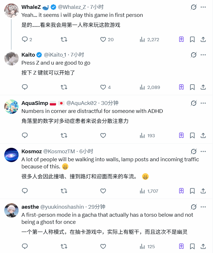 这段实机演示很快在海外玩家群体中传开,引发了热烈讨论,玩家评论的风向也高度一致。有玩家表示“看来我玩这游戏,全程都会开着第一人称”;还有玩家感慨“终于有抽卡游戏的第一人称有躯干了,不用再当只有手的幽灵”;也有玩家调侃“我要在游戏里做些疯狂的事了”。