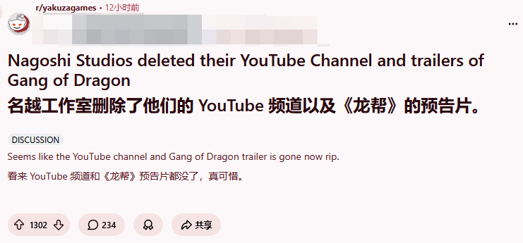“《如龙》之父”名越稔洋一手创办的个人工作室,在未给出任何提前告知的情况下,对其YouTube官方账号进行了全面清理,所有与工作室本身、以及旗下新作《Gang of Dragon》相关的内容均被彻底移除,该作的宣传影像也随之从平台上消失。截至目前,YouTube平台上仅有TGA官方账号,还留存着这款游戏的预告片,成为唯一可查阅的“官方”途径。