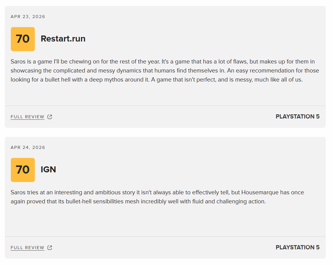 在众多好评之中,给出相对保守评价的两家媒体分别是Restart.run和IGN,这两家媒体都为该作打出了70分的成绩,成为为数不多的非好评评价。