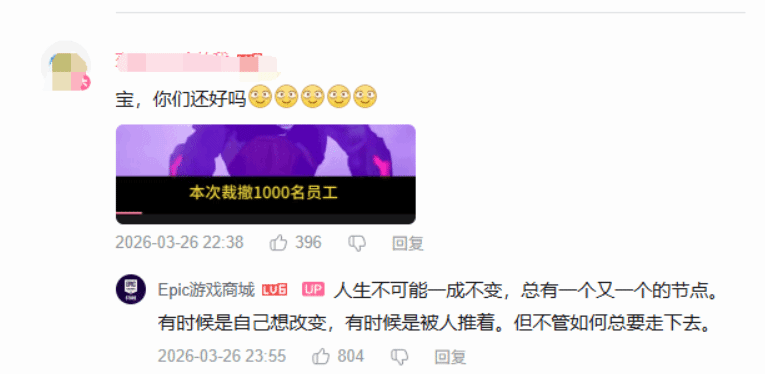 在此之前,面对B站网友的关心与询问时,被玩家爱称为“E宝”的Epic国区运营,曾留下这样一段话:“人生不可能一成不变,总有一个又一个的节点。有时候是自己想改变,有时候是被人推着。但不管如何总要走下去。”