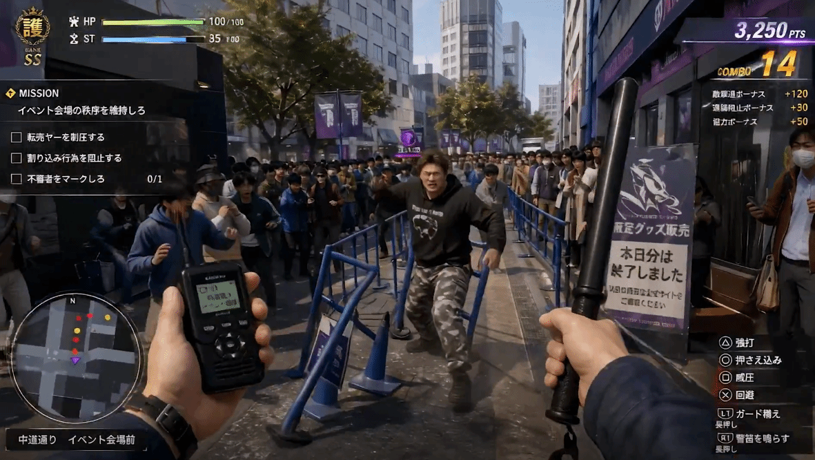 这段视频采用第一人称视角展开,核心任务设定为“打击黄牛、维护活动秩序”,视频中不仅配备了完整的UI界面,包括血条、任务提示等基础元素,其场景搭建和玩法设计,还处处透着《如龙》系列小游戏的熟悉质感,让不少玩家一眼就有了亲切感。