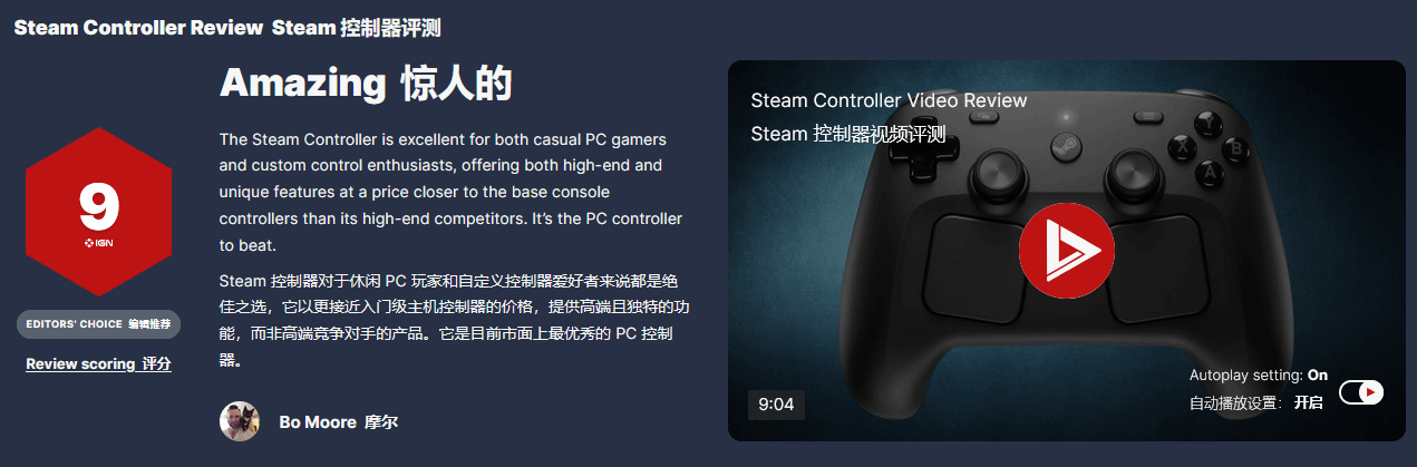 随着Valve宣布新一代Steam手柄将于北京时间5月5日正式发售(国内预估价700-800元),知名游戏媒体IGN的评测也同步解禁。经过提前上手体验,IGN给出了9分的惊人高分,并盛赞其为“PC手柄界的新标杆”。