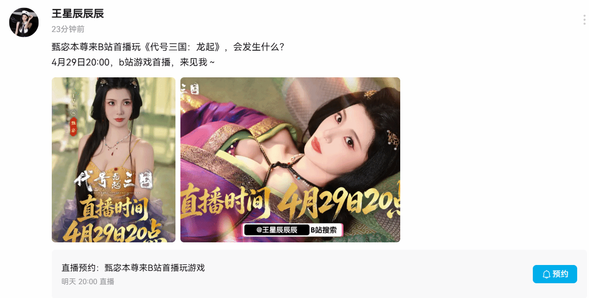 官方预告显示,直播时间定于4月29日20:00,届时王星辰将与观众一同体验游戏内容。配合此次宣传,官方还释出了两张甄宓角色的专属海报。