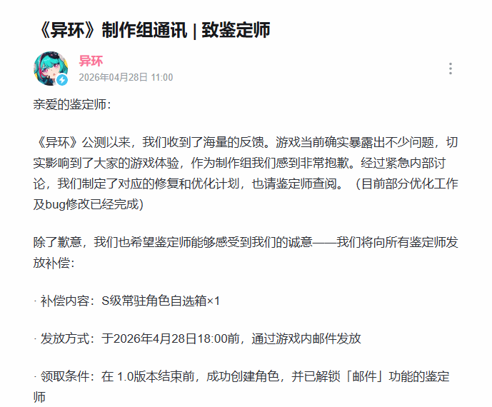 《异环》公测开启后,移动端闪退、掉帧、发热等性能问题引发了大量玩家反馈。4月28日,开发组发布公开信致歉,不仅公布了详细的修复与优化计划,还决定向全体玩家发放“S级常驻角色自选箱×1”作为补偿。