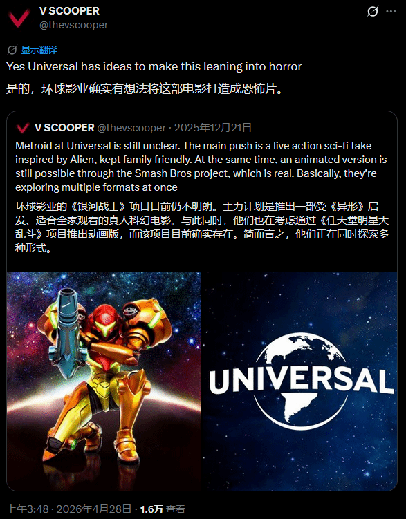 今日,消息爆料者V SCOOPER带来了更多相关信息,据其透露,环球影业若成功获得版权,计划将这部《银河战士》电影打造成恐怖题材作品,打破大众对任天堂IP的固有印象。