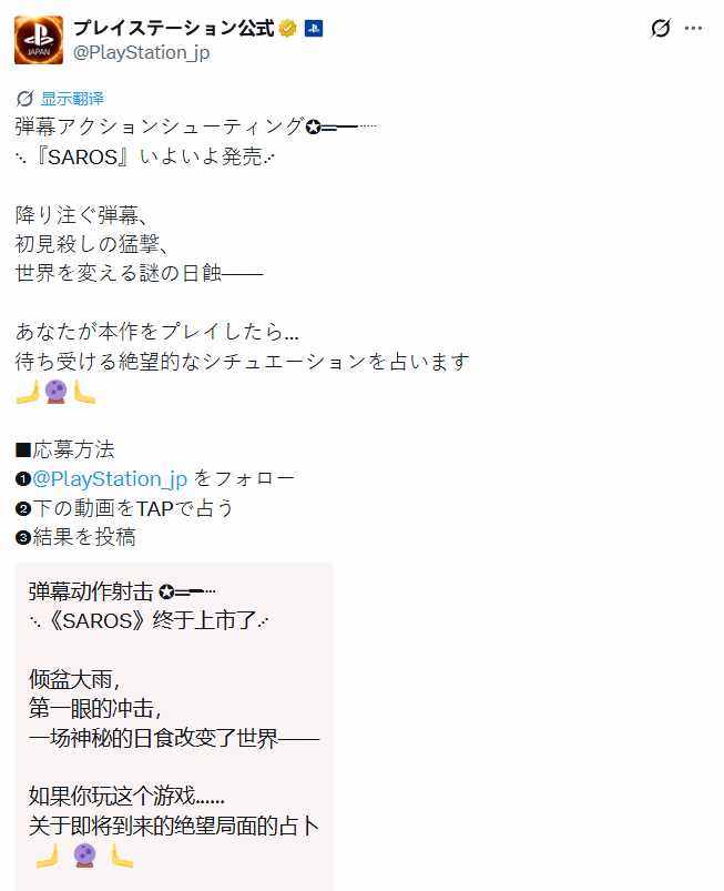 为了庆祝游戏即将上线,PlayStation日本官方账号近日宣布开启了一项主题互动抽奖活动。参与方式非常简单,玩家只需要关注PlayStation日本官方账号,参与其中的“绝望局面占卜”互动环节,并将占卜结果分享出去,就有机会免费赢取“PS5主机 + 游戏本体”的豪华套装。