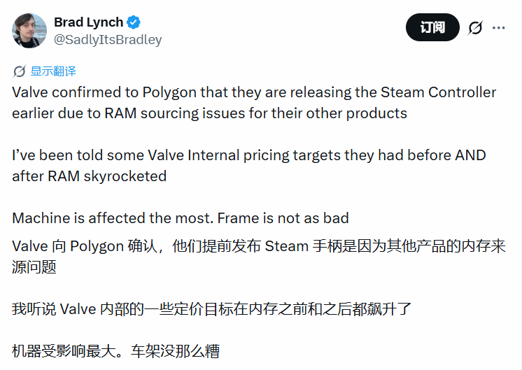 Brad Lynch透露,目前Valve官方尚未公布这两款设备的最终售价,但结合当前的成本压力,他判断最终售价大概率会超出此前市场预期。事实上,V社此前就因内存短缺问题,推迟过Steam主机定价与发售日期的公布,此次定价上调更是供应链压力的直接体现。